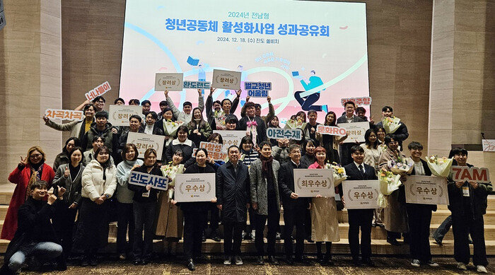 | ▲ 강진군, 지난 18일 진도 쏠비치에서 열린 2024 전남형 청년공동체 활성화 사업 성과공유회에서 ‘다함성교육공동체’의 지역청년공동체 활성화 성과를 인정받아 우수상을 수상 한 후 기념촬영 / 강진군 제공 |