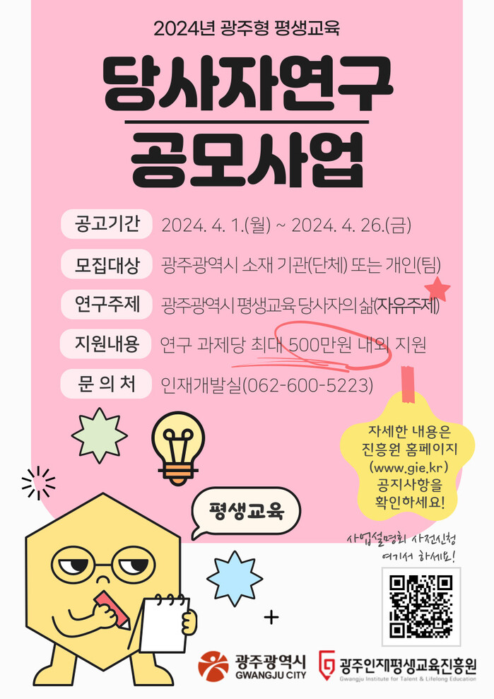 연구주제는 ‘광주광역시 평생교육 당사자의 삶’을 바탕으로 한 자유주제다. 심사를 통해 3개 기관을 선정해 각 500만 원 내외를 지원한다.