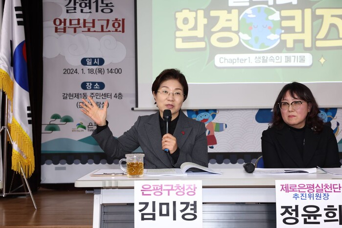 | ▲ 김미경 서울 은평구청장이 갑진년 새해를 맞아 지역내 16개 동을 순회하는 ‘2024년 동 업무보고회’를 성황리에 마쳤다. 사진은 기후환경위기를 퀴즈로 풀어본 갈현1동의 ‘환경퀴즈쇼’에 참여한 김 구청장의 모습.(사진=은평구청 제공) |