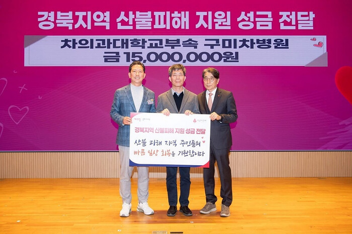 [구미=박병상 기자] 차의과학대학교 부속 구미차병원은 지난 14일 구미시청을 방문해 경북 지역에 발생한 산불 피해 지원 성금 1500만원을 경북사회복지모금회에 전달했다.