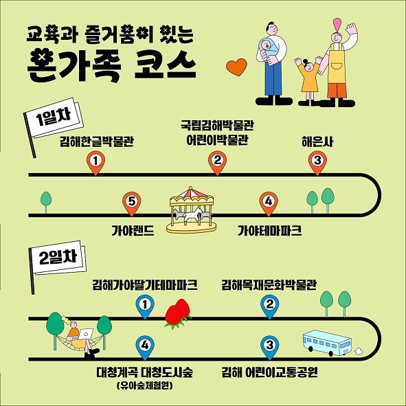온 가족 코스는 1일차 김해한글박물관 → 국립김해박물관 어린이박물관 → 해은사 → 가야테마파크 → 가야랜드, 2일차는 김해가야딸기테마파크 → 김해목재문화박물관 → 김해어린이교통공원→ 대청계곡 대청도시숲(유아숲체험원) 순이다.