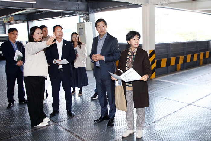 | ▲ 복지건설위원회 위원들이 청구공영주차장 개선공사에 대한 설명을 듣고 있다.(사진=중구의회 제공) |