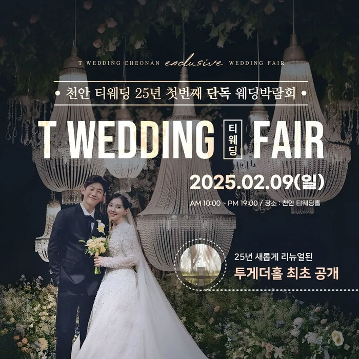 천안아산웨딩홀 ‘티웨딩 천안’이 2월9일(일) 오전10시, 25년 첫 단독 웨딩 박람회를 개최한다.