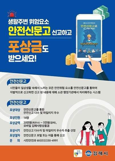 김해시는 일상생활 속 위험요소를 안전신문고로 신고해 안전 개선에 기여한 시민들에게 포상금을 지급하는 ‘안전신고 포상제’를 운영한다고 13일 밝혔다.