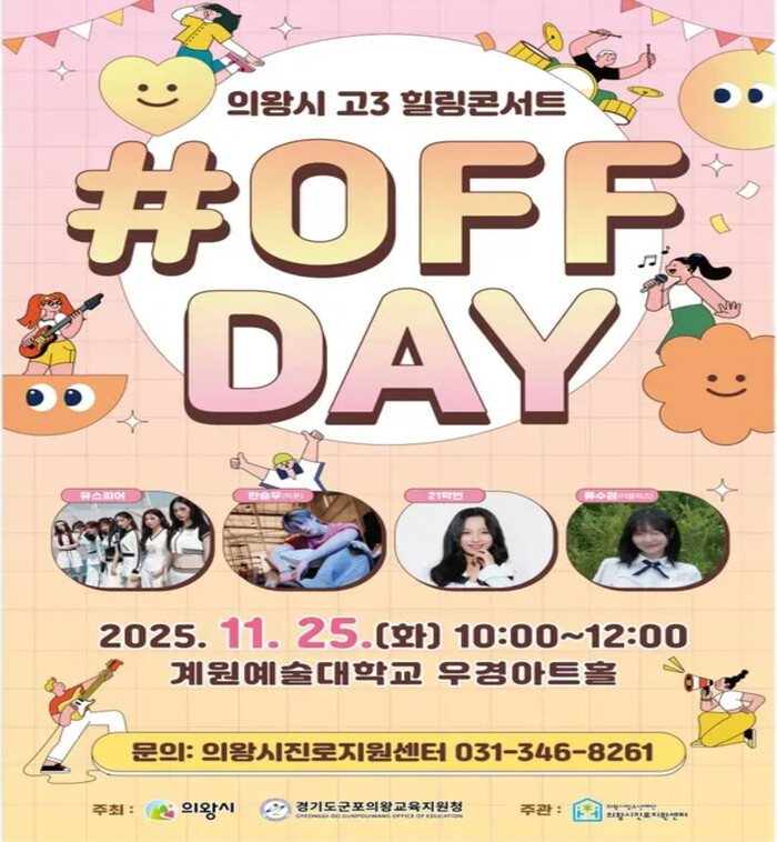 [의왕=송윤근 기자] 경기 의왕시청소년재단(이사장 김성제) 산하 의왕시진로지원센터가 11월 25일 계원예술대학교 우경아트홀에서 수능을 마친 고3 청소년들을 위한 힐링 콘서트 <#OFF DAY>를 개최한다.