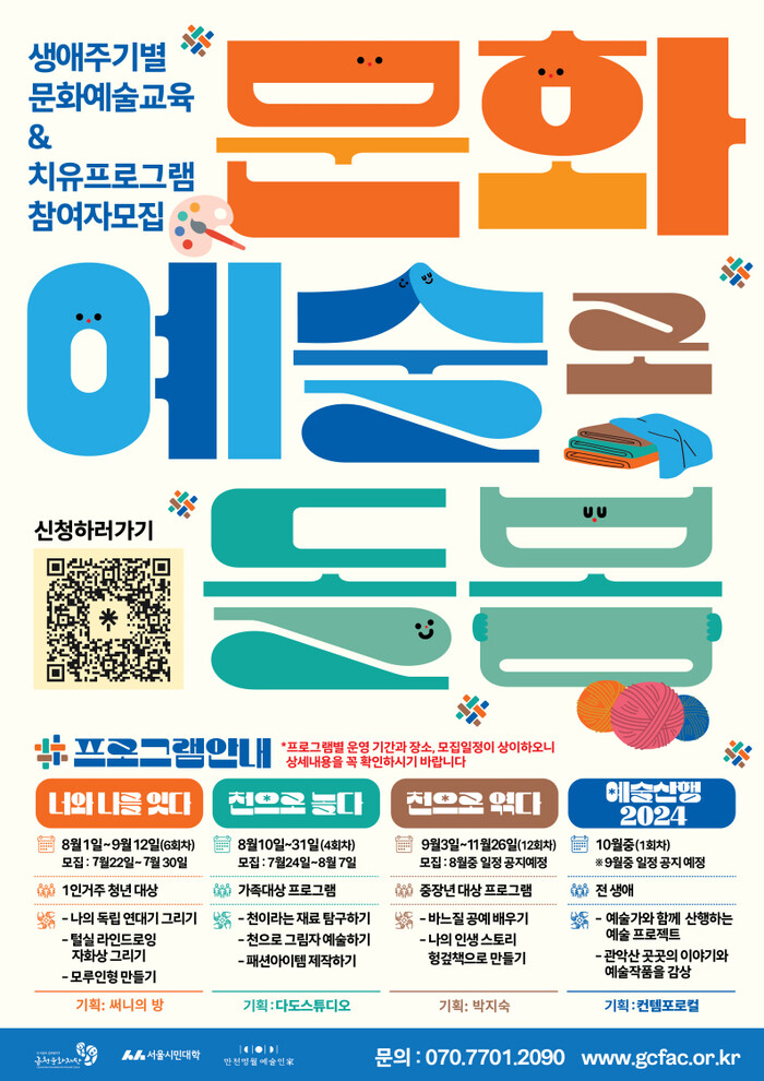 서영철 금천문화재단 대표이사는 “예술은 경험하고 향유하는 것만으로도 치유하는 힘이 있다”라며 “실과 천을 활용한 금천형 문화예술교육에 많은 구민이 참여해 예술이 주는 즐거움과 위로를 만나시길 바란다”라고 전했다.