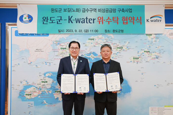 [완도=김우정 기자]완도군(군수 신우철)은 한국수자원공사(K-water) 영·섬유역본부(본부장 백인노)와 지난 9월 22일 ‘완도군 보길·노화 급수 구역 비상 공급망 구축 사업’ 시행을 위한 위수탁 협약을 체결했다.