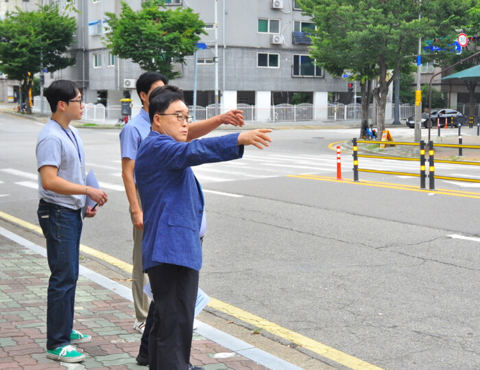 | 김춘수 의원이 무단횡단 방지용 중앙분리대 설치 민원 처리 현장을 확인하고 있다. |