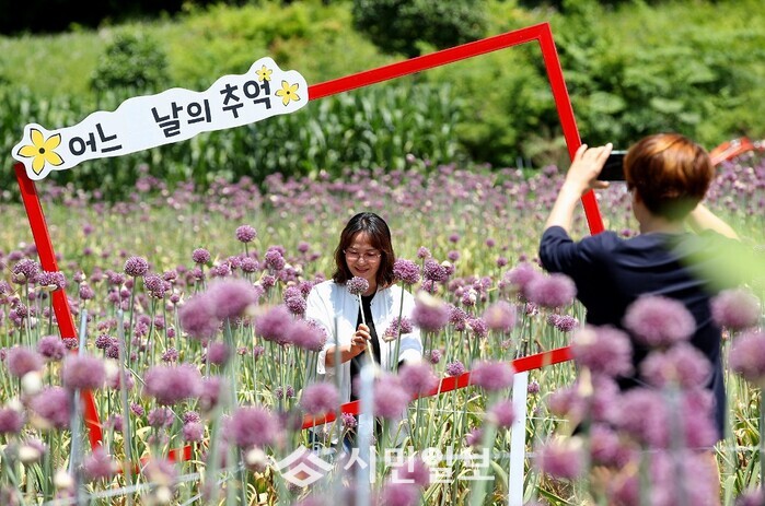 | ▲ 코끼리 마늘 꽃 축제 포토죤 사진촬영 자료사진 / 강진군 제공 |