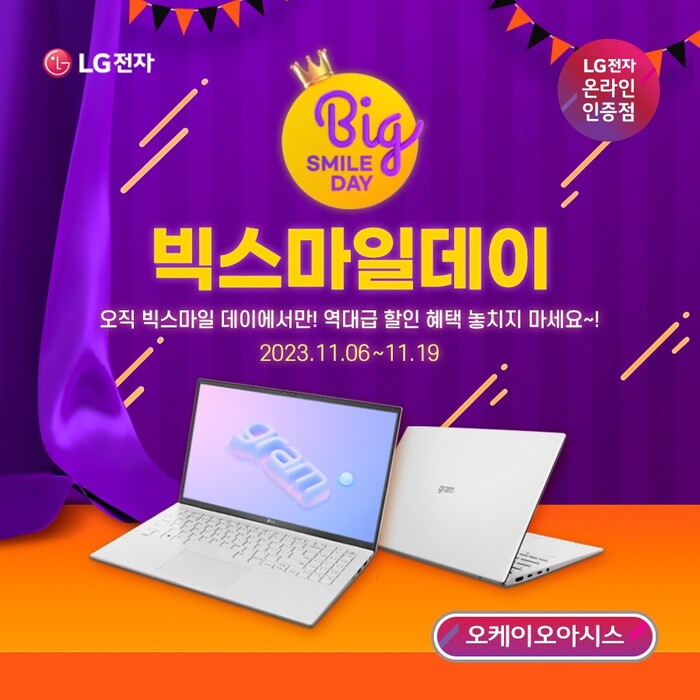 이번 빅스마일 행사는 옥션과 지마켓을 통해 11월 6일부터 17일까지 진행되며, 오케이오아시스는 이번 행사를 통해 LG그램 노트북 중 가장 인기가 높았던 15ZD90RU-GX56K 모델에 대해 파격적인 할인 혜택과 함께 사은품을 증정한다.