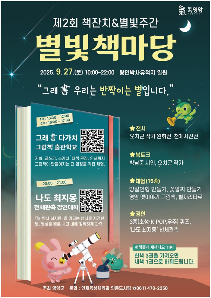 전남 영암군은 이날‘2025 별빛책마당’을 열고, 오전 10시부터 늦은 밤까지 남녀노소가 함께 즐길 수 있는 다채로운 프로그램을 진행한다.