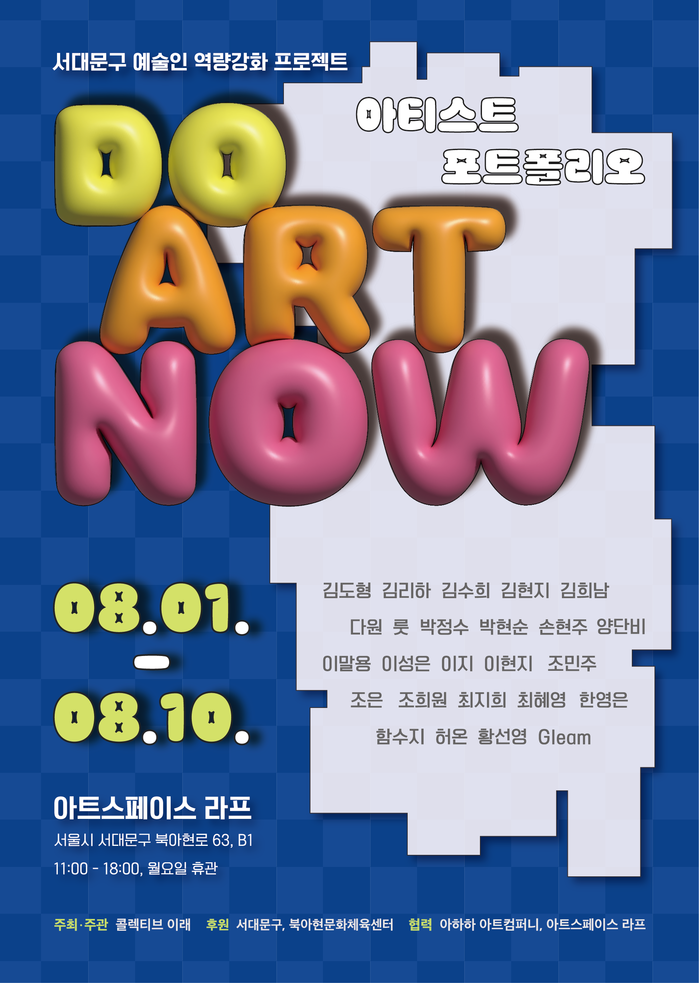 이번 전시는 서대문구 예술인 역량 강화 프로젝트 ‘DO ART NOW’의 결과 발표전으로, 총 25명의 예술인이 (김도형, 김리하, 김수희, 김현지, 김희남, 다원, 룻, 박정수, 박현순, 손현주, 양단비, 이말용, 이성은, 이지, 이현지, 조민주, 조은, 조희원, 최지희, 최혜영, 한영은, 함수지, 허온, 황선영, Gleam) 참여했다. 그리고 강사로는 홍경한 미술평론가, 황규진 부천 아트벙커B39 전시 디렉터, 아하하 아트컴퍼니 이현희 대표가 초빙됐다.