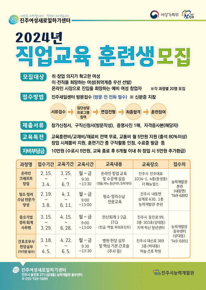 진주시 능력개발관 부설 진주여성새로일하기센터(이하 진주새일센터)에서는 오는 15일부터 경력단절여성을 대상으로 ‘2024년 직업교육훈련 교육생’을 모집한다.