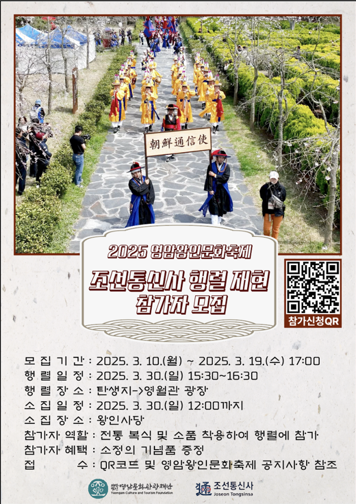 영암문화관광재단에서 조선통신사 행렬 참가자를 모집한다. 영암왕인문화축제 공식 누리집을 이용하거나 자세한 사항은 영암문화관광재단으로 문의하면 된다.