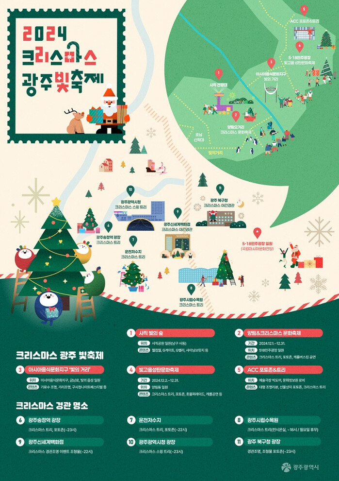 광주시청 잔디광장 크리스마스스윙, 광주 송정역 광장 크리스마스트리, 광주시립수목원 전시온실 크리스마스트리, 북구청 광장 크리스마스 야간경관, 운천저수지 크리스마스트리, 광주신세계백화점 야간경관 등 광주 곳곳이 아름다운 조명과 포토존으로 꾸며진다.
