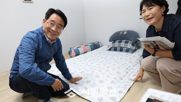 | ▲ 강진원 군수가 강진읍 한 가정을 방문 시원한 잠자리를 보장하는 쿨매트를 살펴보고 있다. / 강진군 제공 |