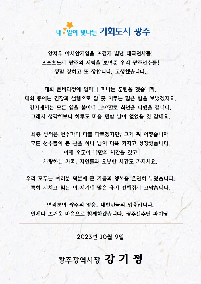 | ▲ 강기정 광주광역시장, 중국 항저우 아시안게임 출전 광주시 소속 선수단 선전 축하 메시지 전문 / 광주광역시 제공 |