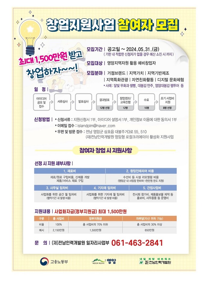 지역자원 활용 창업 지원사업에 대한 자세한 내용은 영암군홈페이지에서 볼 수 있고, 안내와 신청은 (재)전남인력개발원에서 한다.