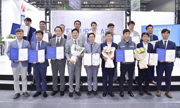 ‘2023 광주미래산업엑스포’를 겸해 지난 29일 김대중컨벤션센터에서 열린 시상식에서 김광진 광주시문화경제부시장은 산업통상자원부장관상 1명, 광주시장상 13명, 광주전남지방중소벤처기업청장상 2명 등 유공자 16명에게 표창장을 수여하고 격려했다.