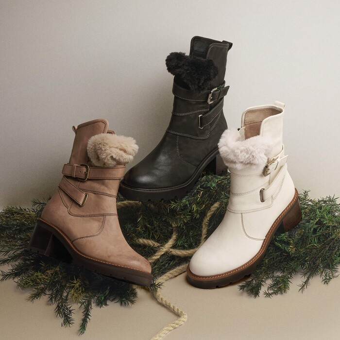 발목 바깥 면의 양털 원단으로 시각적인 보온 효과를 주며 맵시 있는 라인과 발목을 휘감은 벨트 디자인으로 위트를 더했다. 또한 신발 라인을 따라 더해진 스티치 포인트로 고급스러운 느낌을 자아낸다.