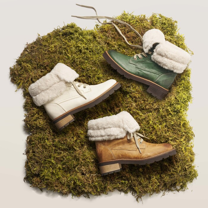 연베이지, 카멜, 진녹색 세 가지의 컬러로 출시된 ‘빈티지 양털 부츠’는 겨울철 눈길, 비 오는 날 등 무리 없이 착용이 가능하다.