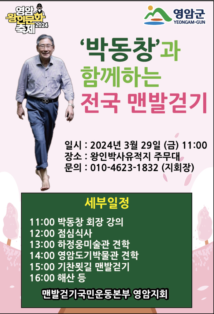 박 회장은 행사장에서 맨발 걷기의 효과와 즐거움, 안전하게 걷는 법 등을 알리고, 참가자들과 벚꽃 만발한 기찬묏길을 걸을 예정이다.
