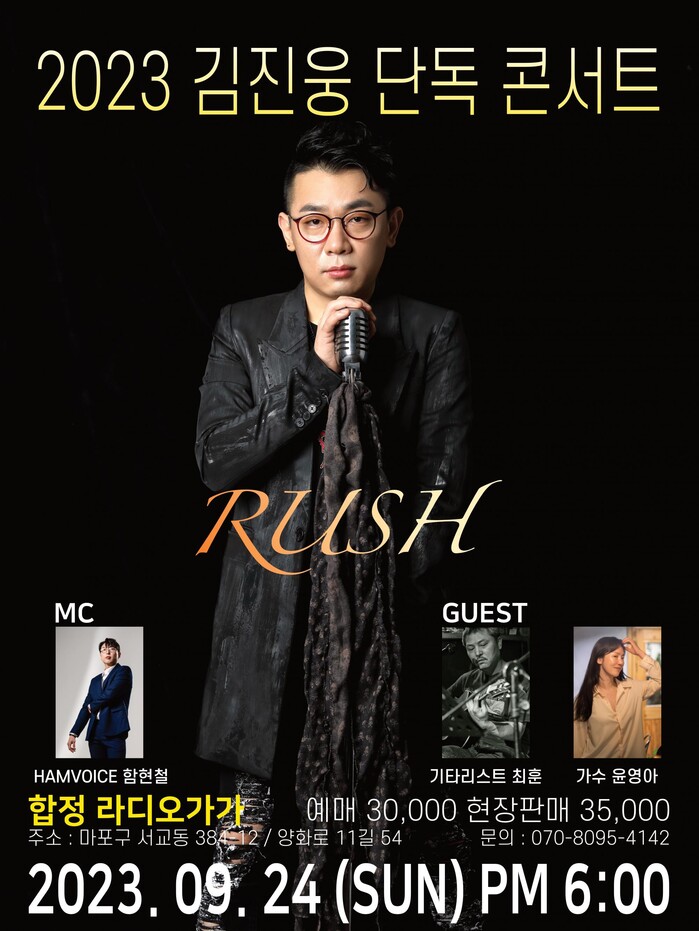 와이키키 브라더스 밴드의 리드 보컬 김진웅이 추석을 앞둔 9월 24일 합정동 '라디오 가가'에서 신곡 '러쉬' 발표와 단독 콘서트 진행한다.