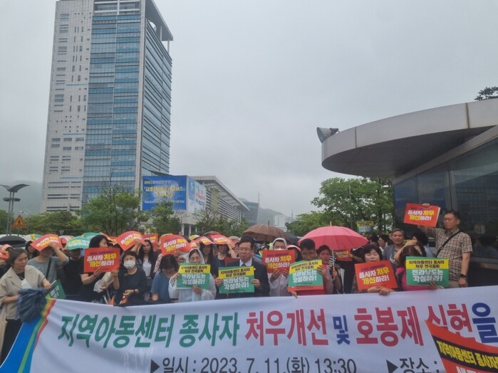 | ▲ 전남지역 아동센터, 지난11일 도청 입구 시위 장면(사진=황승순 기자) |