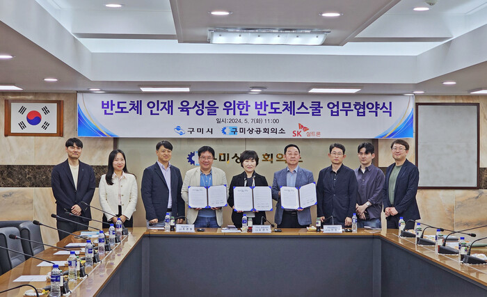 [구미=박병상 기자] 경북 구미상공회의소(회장:윤재호)는 지난 7일(화) 11시 구미상공회의소 3층 회의실에서 장동기 구미상공회의소 사무국장, 유경숙 구미시 경제산업국장, 조경철 SK실트론 대외협력담당을 비롯한 구미상의, 구미시, SK실트론 관계자가 참석한 가운데 「SK실트론과 함께하는 반도체스쿨」업무협약식을 개최했다.