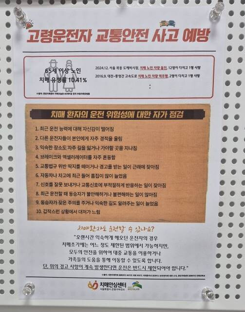 이외에도 치매안심센터는 실제 치매 노인의 자가운전으로 인해 발생한 사고 사례가 빈번해짐에 따라 치매 환자 또는 가족을 위한 프로그램 운영 시 ‘고령운전자 교통안전 사고 예방’에 대한 동영상 시청 등 교육을 진행하고 있으며, 앞으로도 치매 관련 위험을 예방하고 지역사회 안전망을 강화하기 위한 다양한 홍보 활동을 이어나갈 계획이다.