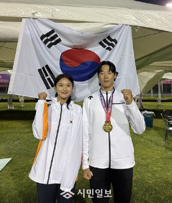 | ▲ 광주광역시청 직장운동경기부 소속 육상부문 이재성 강다슬 선수, 2025 아시아육상경기선수권대회 남녀 400m 계주 금메달 수상 기념촬영 / 광주광역시 제공 |