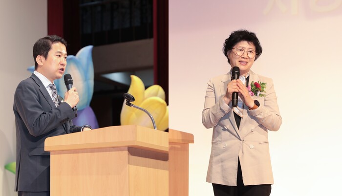 | ▲ 안산시의회 송바우나 의장(왼쪽)과 박은경 의회운영위원장이 13일 안산시 올림픽기념관에서 열린 ‘안산시어린이집연합회 제43회 스승의 날 기념 행사’에 참석해 축사를 하고 있다.사진제공=안산시의회 |