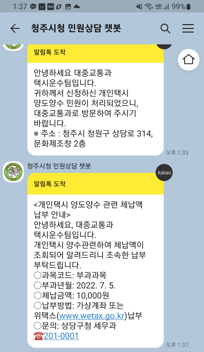 또한 수신된 알림톡에서 청주시 민원상담 챗봇을 이용하면 청주시 민원상담을 편리하게 이용할 수 있다. 단, 카카오톡 미사용 이용자는 기존과 같이 문자서비스로 안내를 받게 된다.