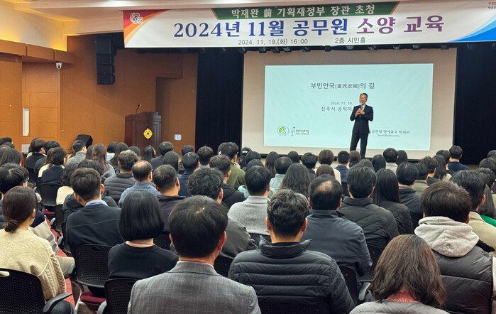 진주시는 19일 시청 2층 시민홀에서 공무원 200여 명이 참석한 가운데 박재완 前 기획재정부 장관을 초청하여 소양교육을 실시했다.