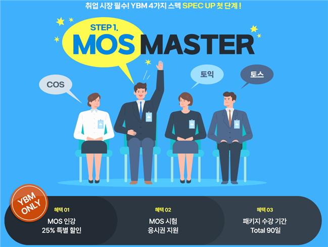 이번 이벤트는 MOS Master 자격증 과정 중 입문 패키지 과정과 실전 패키지 과정을 신청하는 수강생 대상으로 진행된다. Master 패키지 과정을 구매하면 수강료를 최대 25%할인 받을 수 있다. 또, 수강생 모두에게 MOS 시험 응시권을 무료로 준다.
