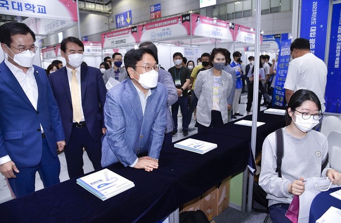 [광주=정찬남 기자] 강기정 광주광역시장이 16일 오후 서구 김대중컨벤션센터에서 열린 '2023학년도 대입 광주진로진학박람회'에 참석해 이정선 광주시교육감, 윤영덕 국회의원 등 내빈들과 전시장을 둘러보고 있다./광주광역시 제공