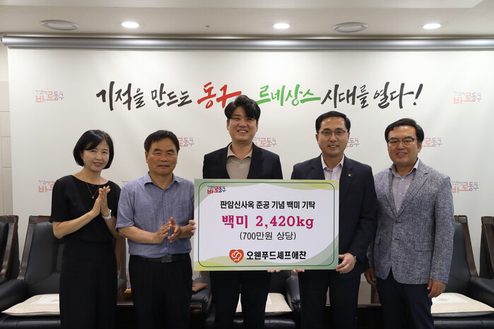 최근 셰프애찬이 판암신사옥 준공 기념 쌀 화환 백미 2,420kg을 대전 동구청에 기탁했다.