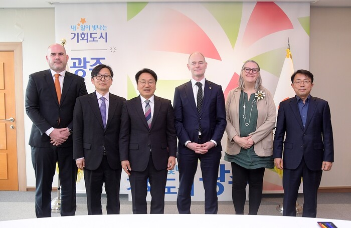 | ▲ 강기정 광주광역시장이 17일 오전 시청 접견실에서 오시안 스미스 아일랜드 공공지출 및 개혁부 차관의 예방을 받고 민주주의 가치에 대해 공유하고 도시 간 협력방안을 논의한 후 기념촬영을 하고 있다. /광주광역시 제공 |