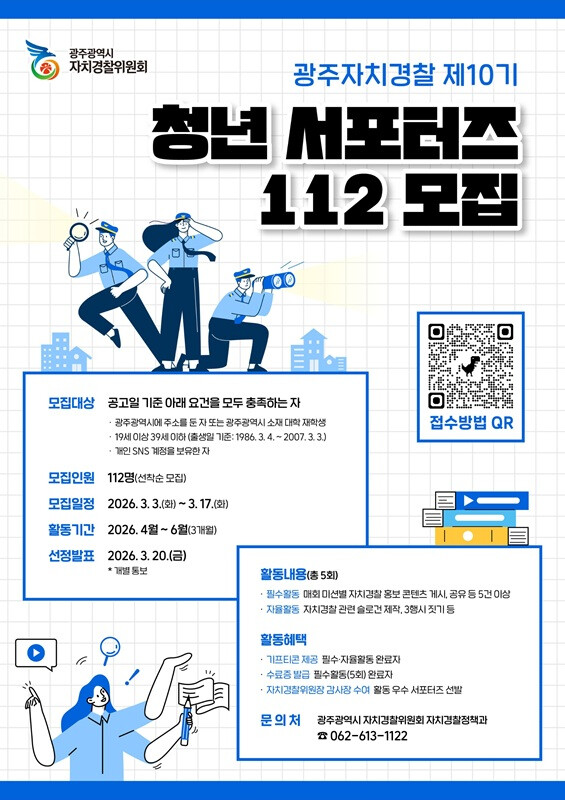 ‘청년 서포터즈 112’는 광주자치경찰위원회가 2021년 전국 최초로 도입한 청년 참여 프로그램으로, 청년들이 사회관계망서비스(SNS)를 활용해 자치경찰의 주요 시책과 정책을 홍보하고, 시민과의 소통창구 역할을 수행한다.