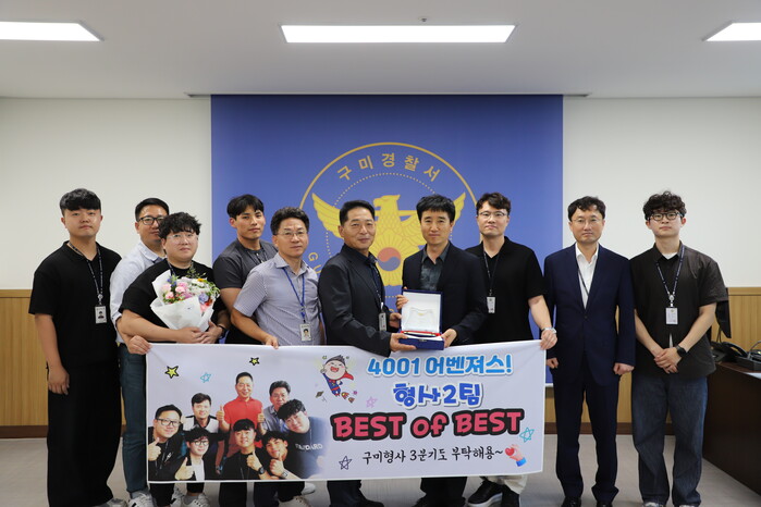 [구미=박병상 기자] 경북 구미경찰서 형사2팀이 2024년 2분기 경북청 베스트형사팀에 선정되어 지난 18.(목) 구미경찰서에서 진행된 포상수여식에서 인증패 및 경북경찰청장 표창을 받았다.