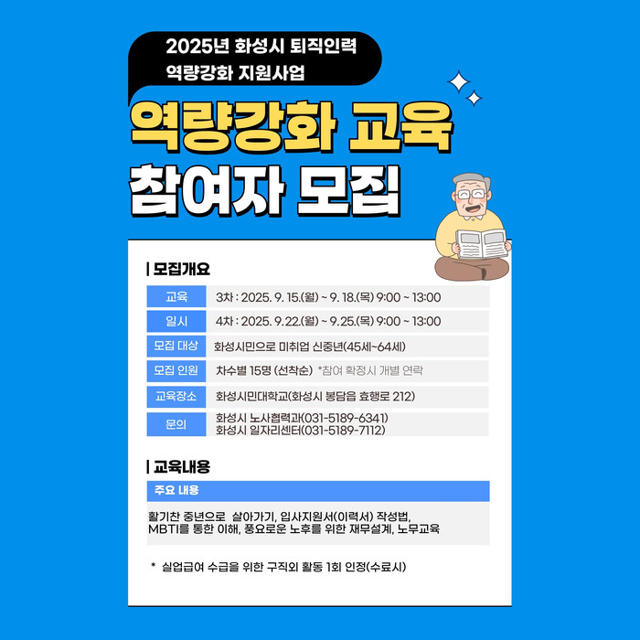 [화성=송윤근 기자] 경기 화성특례시(시장 정명근)가 퇴직 인력의 사회 재진출과 노후 준비를 돕기 위한 역량강화 교육 3·4기 참여자를 선착순 모집한다고 14일 밝혔다.