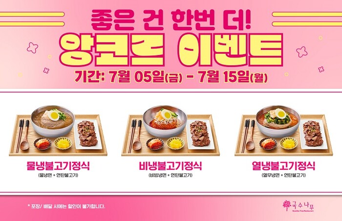 국수나무는 앵콜 이벤트로 물냉면에 연탄불고기를 곁들인 '물냉불고기정식', 비빔냉면에 연탄불고기를 곁들인 '비냉불고기정식', 열무냉면에 연탄불고기를 곁들인 '열냉불고기정식' 총 3종을 할인된 가격으로 제공한다. 해당 할인 프로모션을 통해 소비자들은 더욱 합리적인 가격에 국수나무의 시원한 냉면을 만나볼 수 있다.