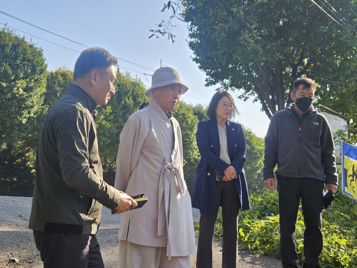 | 고선희 의원과 관계자들이 추락 위험 도로 현장을 점검하고 있다. (사진=서구의회) |