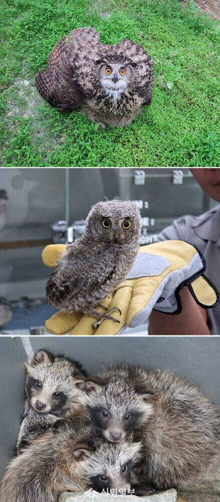 | ▲ 상단부터 수리부엉이, 소쩍새, 너구리 자료사진 / 광주광역시 제공 |