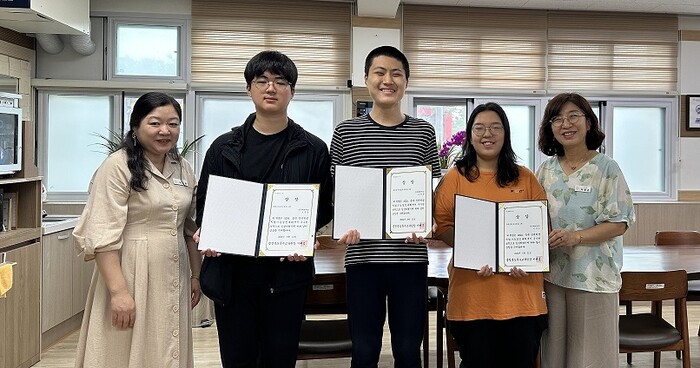 | ▲ 사진설명: 왼쪽부터 이정희 교감, 조유민, 조한규, 이정은 학생, 이영순 교장 |