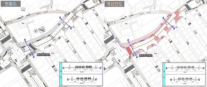 개선 방안으로는 ▲차로 및 보도 재배분 설치 ▲교차로 형태 개선으로 교통안전 확보 ▲최소 회전반경 확보 ▲골목길 내 회전교차로 설치 등을 마련했다.