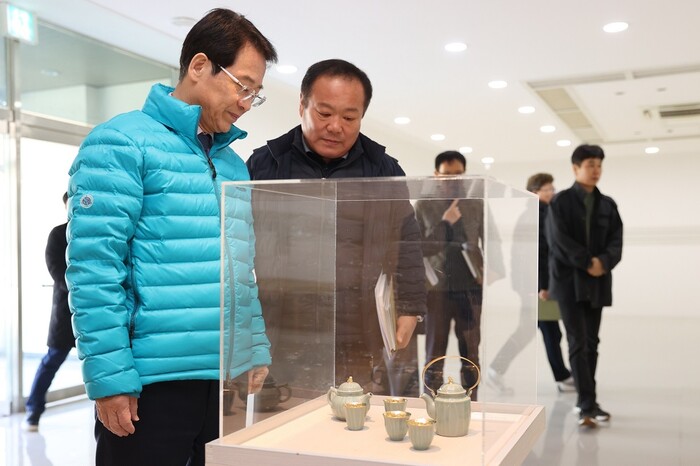 | ▲ 강진원 군수가 지난 16일 강진 민간요 개발 신상품 전시실을 방문해 전시된 도자 다기세트를 살펴보고 있다. / 강진군 제공 |