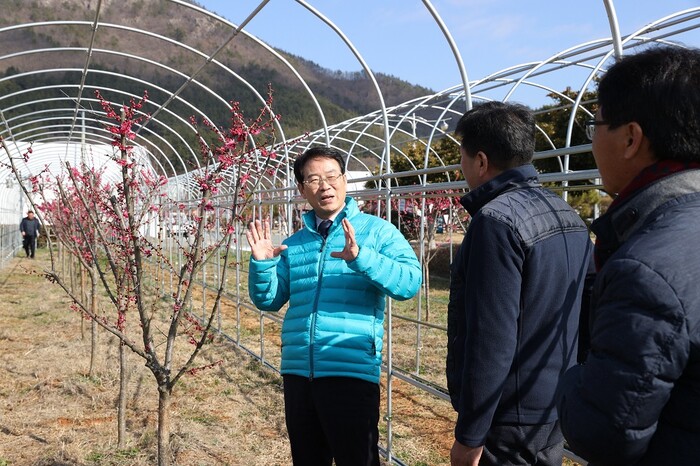 | ▲ 강진원 군수가 지난 16일 개화한 홍매화 나무 단지를 방문해 관계자에게 축제 시작까지 철저한 관리를 당부하고 있다. / 강진군 제공 |