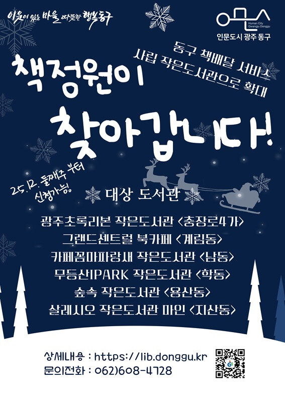 책 배달 서비스 및 기타 자세한 사항은 동구 도서관 누리집을 참고하거나 인문도시정책과 도서관팀으로 문의하면 된다.
