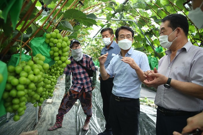 | ▲ 강진원 강진군수(가운데)가 군에서 소득과수로 집중육성하고 있는 품종의 일명 ‘망고포도’로 불리는 샤인머스켓 포도 수확현장을 방문해 관계자들과 대화를 나누고 있다. / 사진=강진군 제공 |